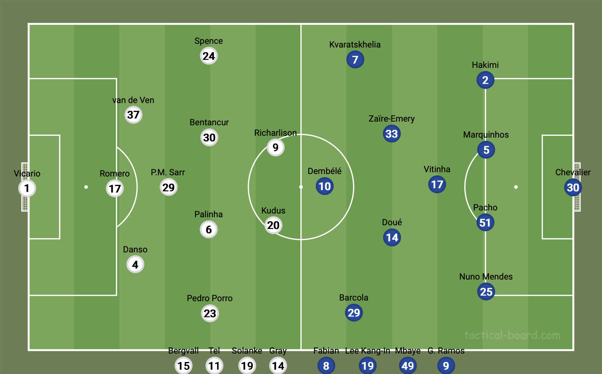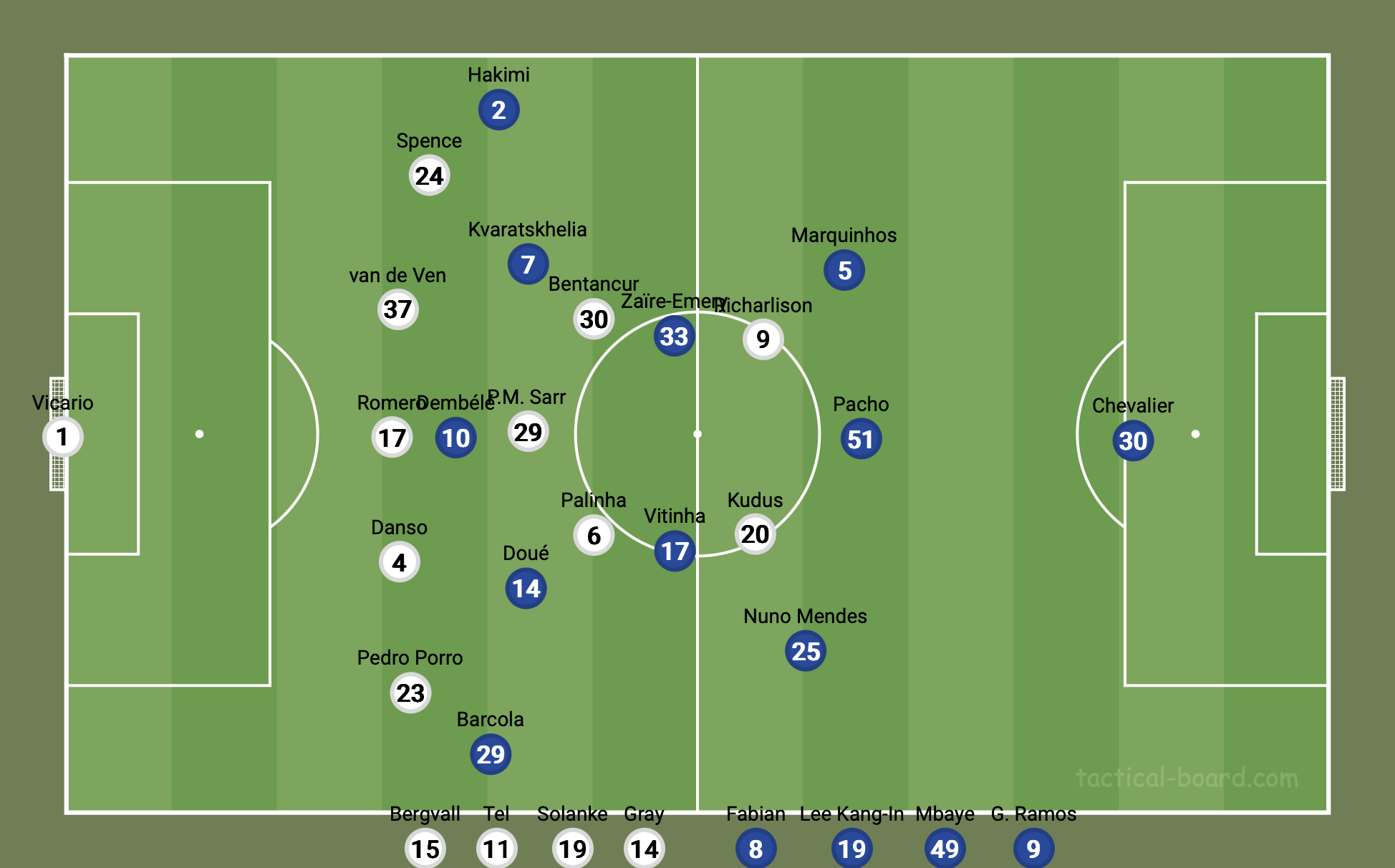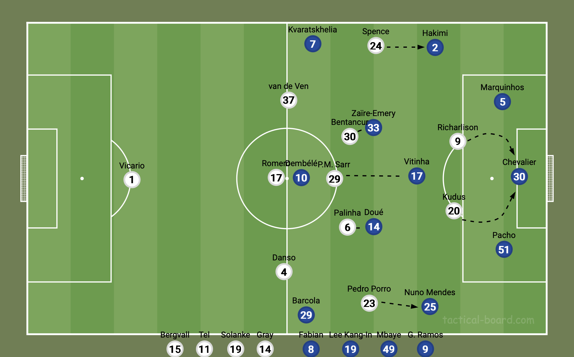 Frank’s plan was incredibly effective, but it demanded incredible effort from his players. The man-to-man nature of the press meant it was incredibly draining, especially for the midfielders. As the match went on, tired legs began to show. The exhaustion forced Frank to his bench, which helped PSG back into the game. It was in the depth of the squads that PSG began to flex their muscle as continental champions. Spurs would bring on Gray, Solanke, Tel, and Bergvall, while PSG would bring on Fabian, Mbaye, Ramos, and Lee Kang-In (the last two both scoring goals). The substitutions were a potent reminder of which team was the reigning continental champion and which team narrowly avoided relegation the season prior. With the intent of protecting tired players and hanging on to a lead, Frank would drop Spurs into a low block for the final stages. However, this would ultimately play into PSG’s hands. Against a low block, PSG were finally able to open up, with their wide rotations creating chance after chance. The addition of Ramos also allowed Dembélé to move over to the right, where he would ultimately play the cross that led to Ramos’ stoppage time equalizer.